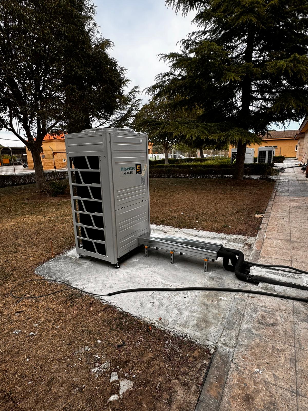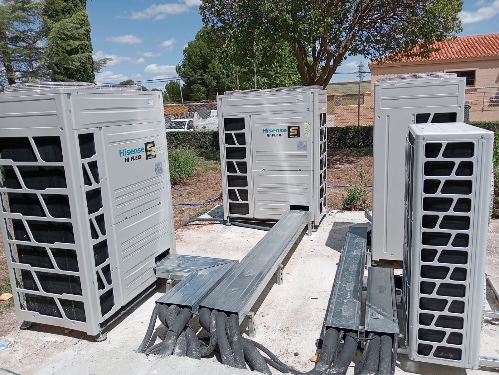 Air-conditioning installation consisting of 6 Hisense brand VRV air-conditioning systems with heat recovery, with a total capacity of 185 KW refrigeration, supplying 60 indoor units consisting of 28 splits and 32 cassettes of different power ratings.