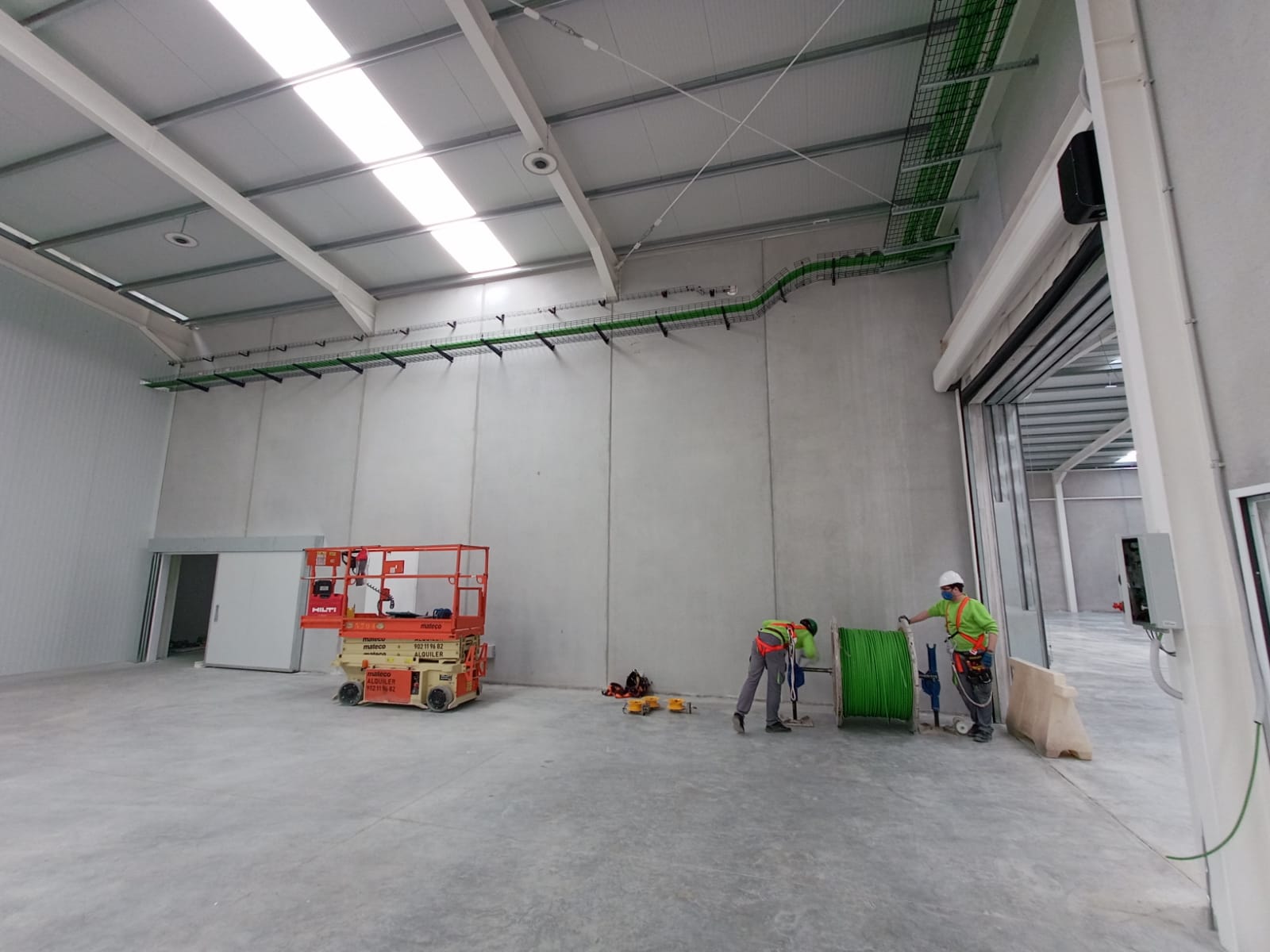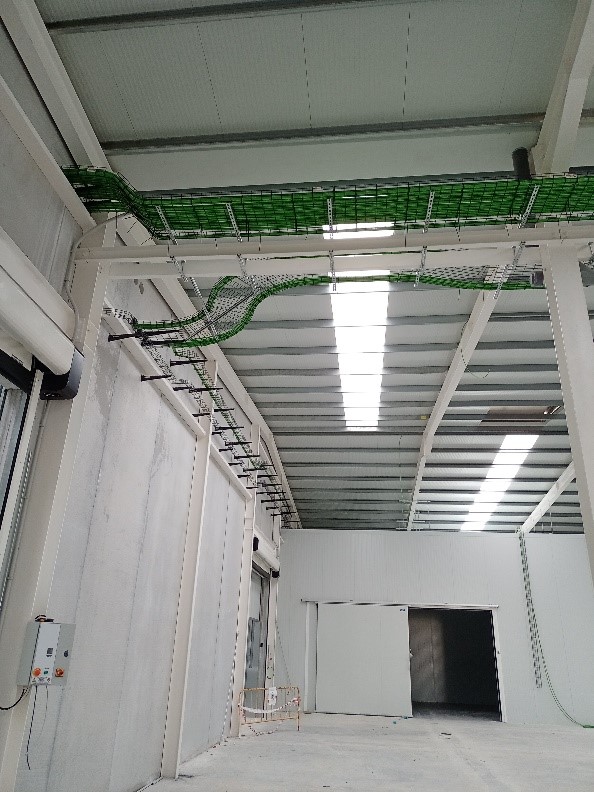 Instalación de iluminación Philips Mod: BY470X mediante canalización por bandeja y tubo de PVC visto. Se instalan unas pantallas inteligentes de 13.000lux las cuales pueden configurarse entre ellas para hacer zonificaciones de iluminación totalmente configurables entre ellas. Instalación de iluminación Philips Mod: BVP121P G3, mediante canalización por bandeja y tubo de PVC visto. Se instalan unas pantallas de 20500lux estas son accionadas mediante pulsadores dirigidos a telerruptores.